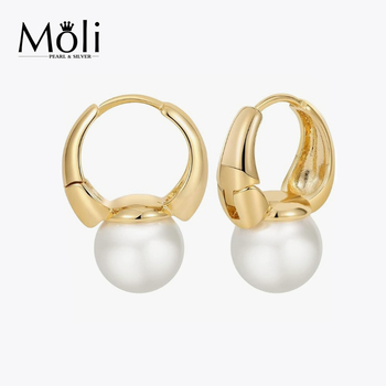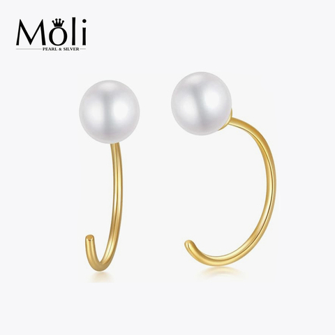 Lapisan emas 925 perak murni cincin Hoop 5-6mm putih alami bulat mutiara Fashion Anting untuk wanita hadiah perhiasan